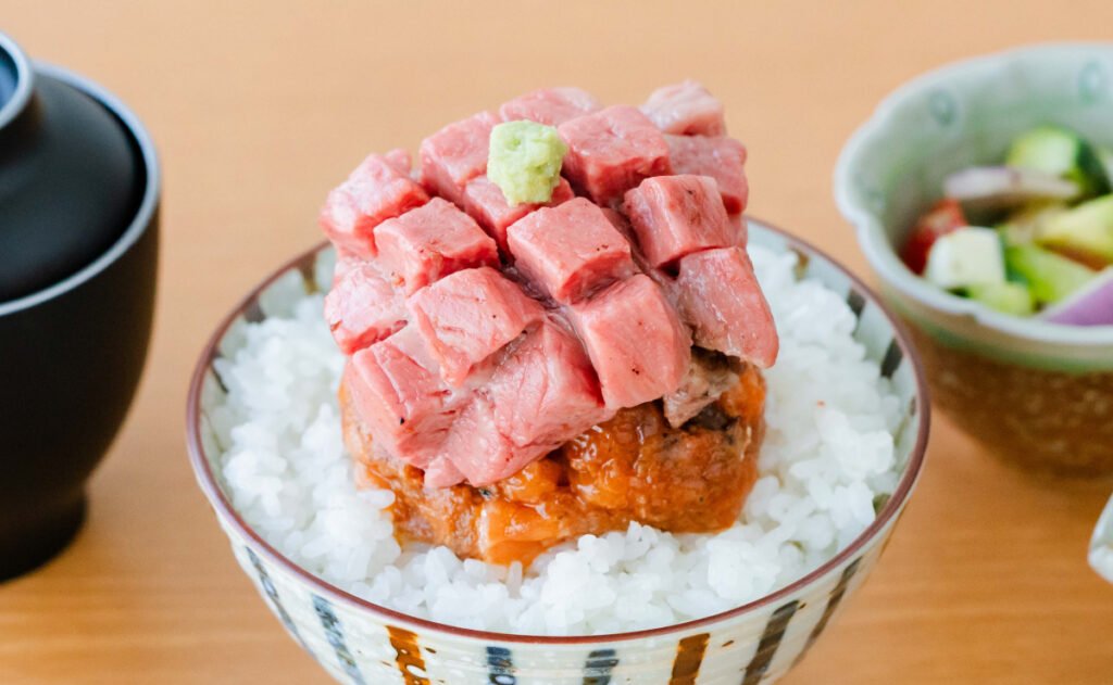 淡路和牛A5ランクの希少部位を格子状にカットすることで、特製タレがしっかりと絡み、口に広がる濃厚な味わいと食べ応えがある花咲マスとろ丼。